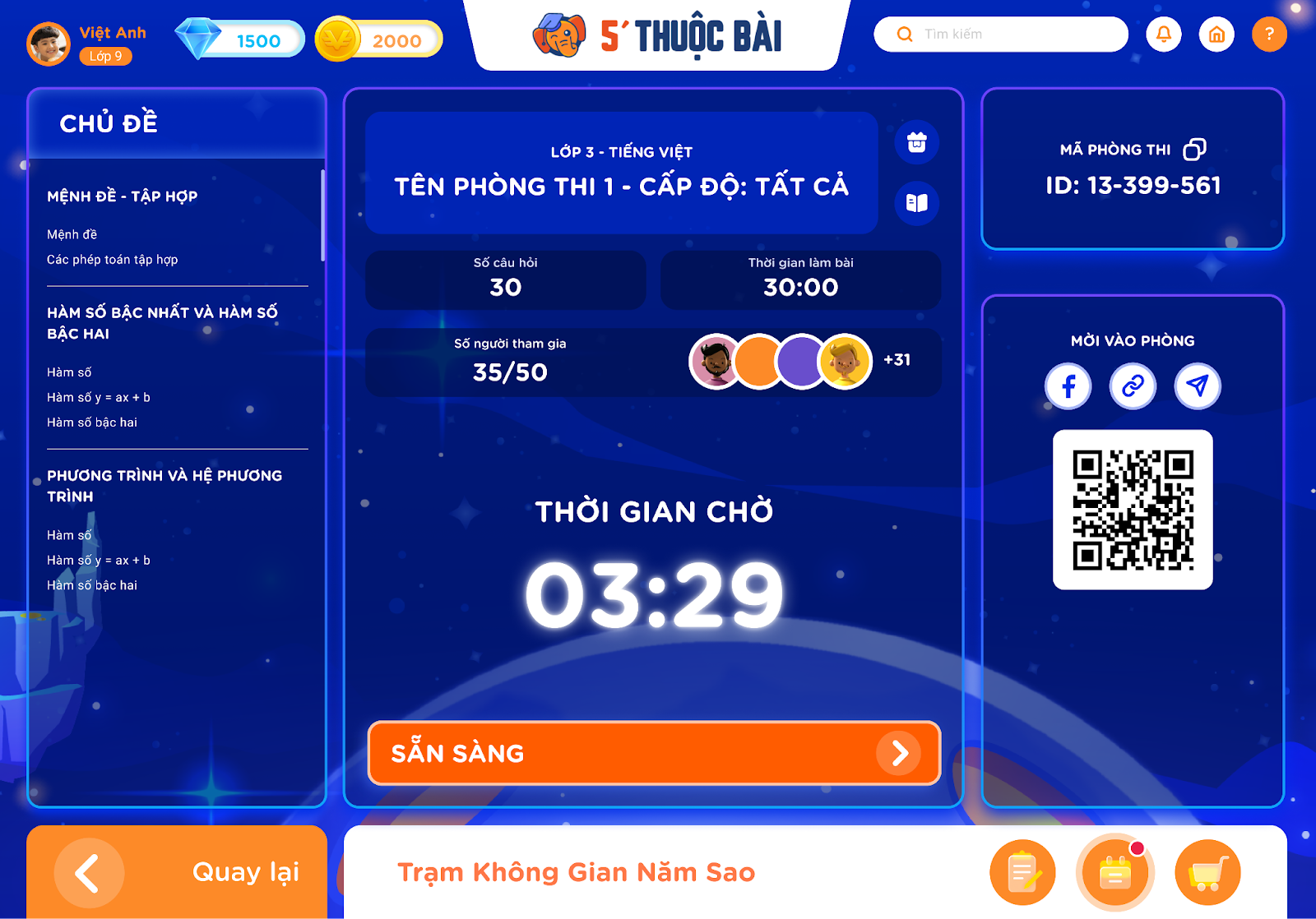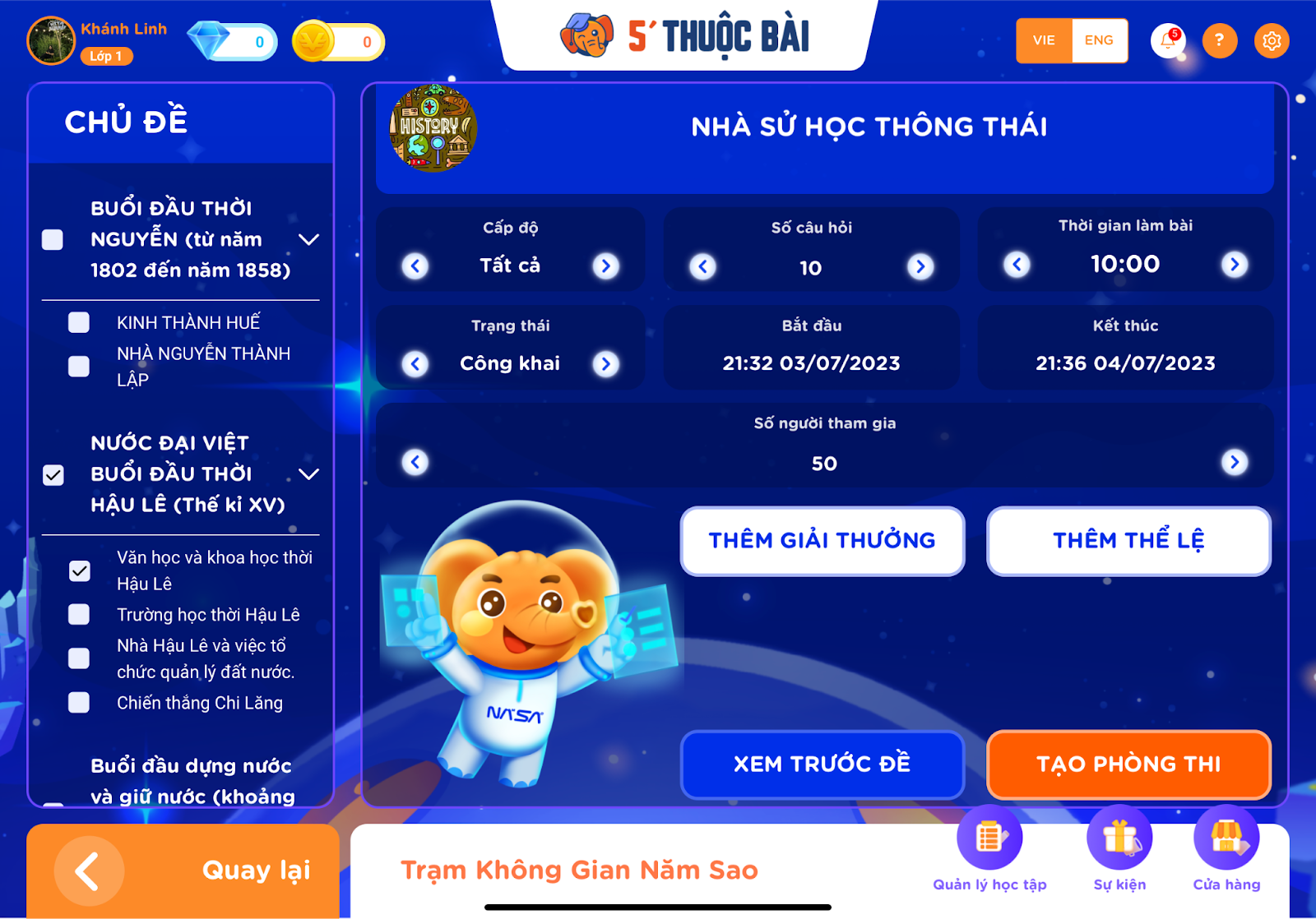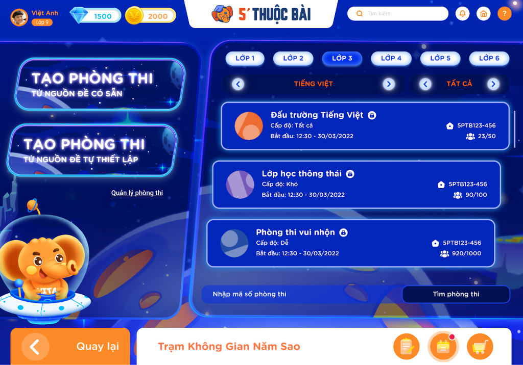 Chủ động tạo phòng thi dễ dàng dù bạn là thầy cô hay học sinh. Đặc biệt, Trạm Không Gian 5 Sao sẽ cung cấp kho đề thi chất lượng có sẵn từ lớp 1 – lớp 12 nếu bạn chưa có nguồn đề.