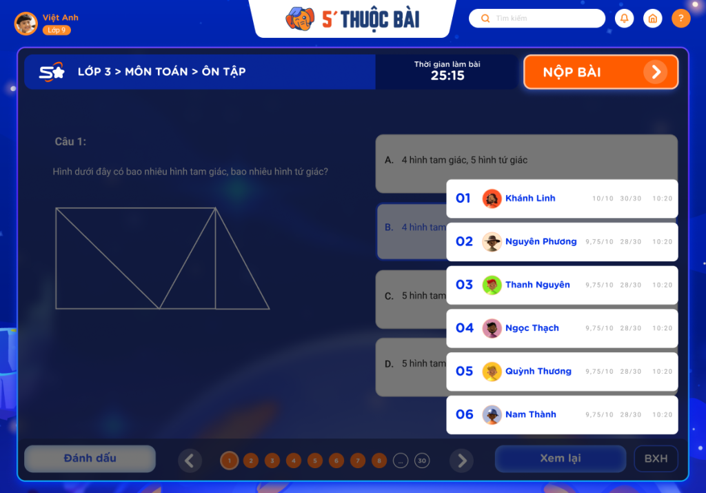 Bảng xếp hạng Chiến thần của các Thí sinh sẽ được cập nhật liên tục theo kết quả thực bao gồm số câu đúng và thời gian trả lời nhanh nhất. Nhớ theo dõi bảng xếp hạng để tiếp thêm động lực thi đấu và trở thành Cao thủ Học đường nha!